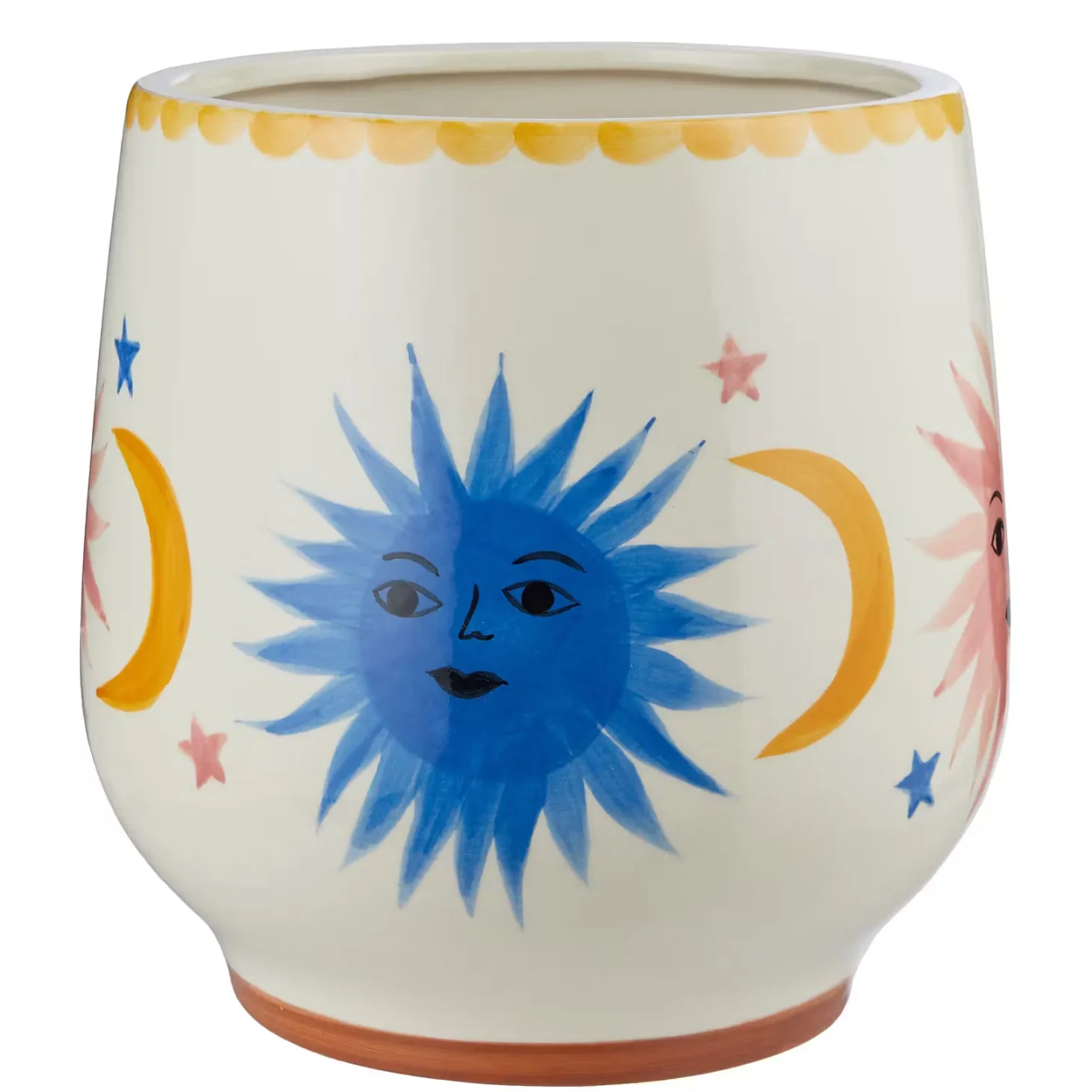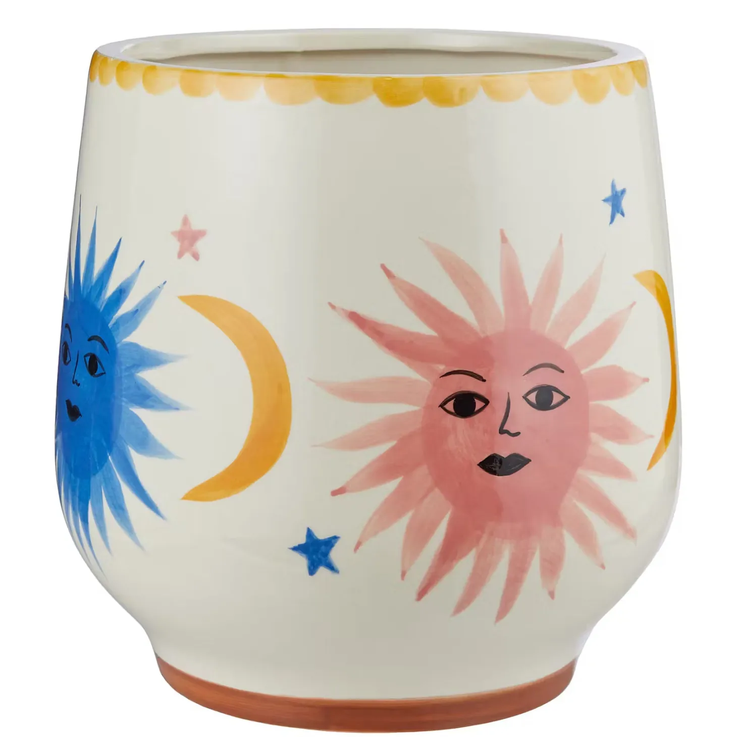 Ein himmlisches Motiv ziert den hübschen Spirit Blumenübertopf aus Steingut. Das liebevolle Design harmoniert mit deiner verspielten oder romantisch angehauchten Einrichtung, und auf dem gedeckten Tisch kombinierst du diesem Blumenübertopf einfach mit natürlichen Materialien und pastelligen Farben.