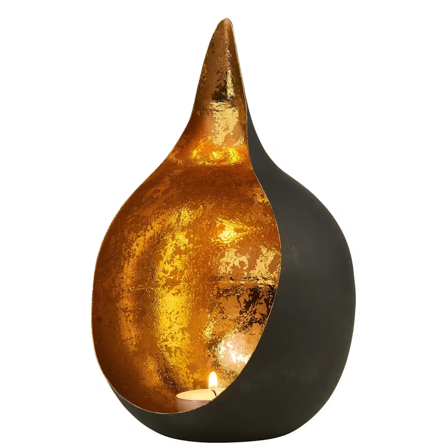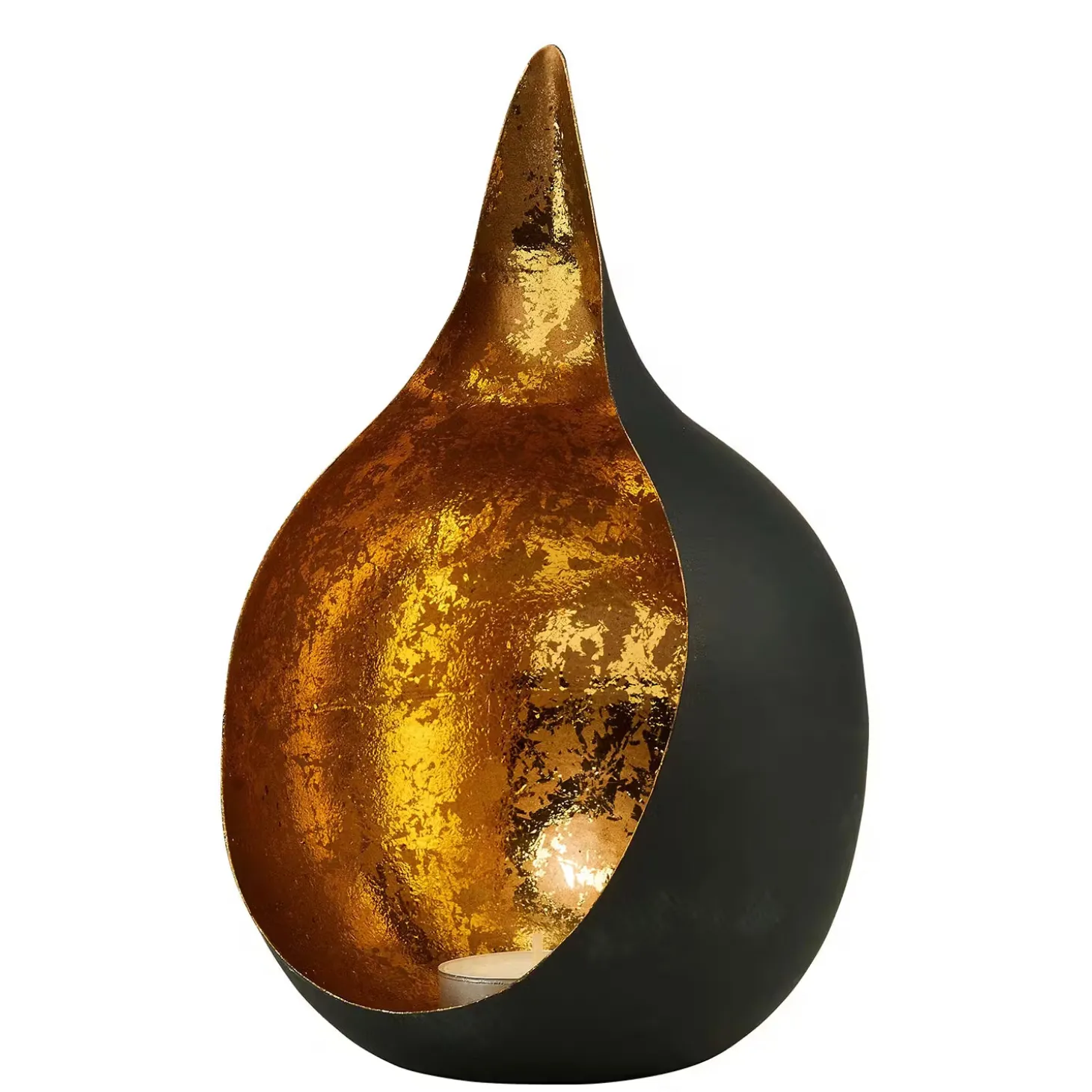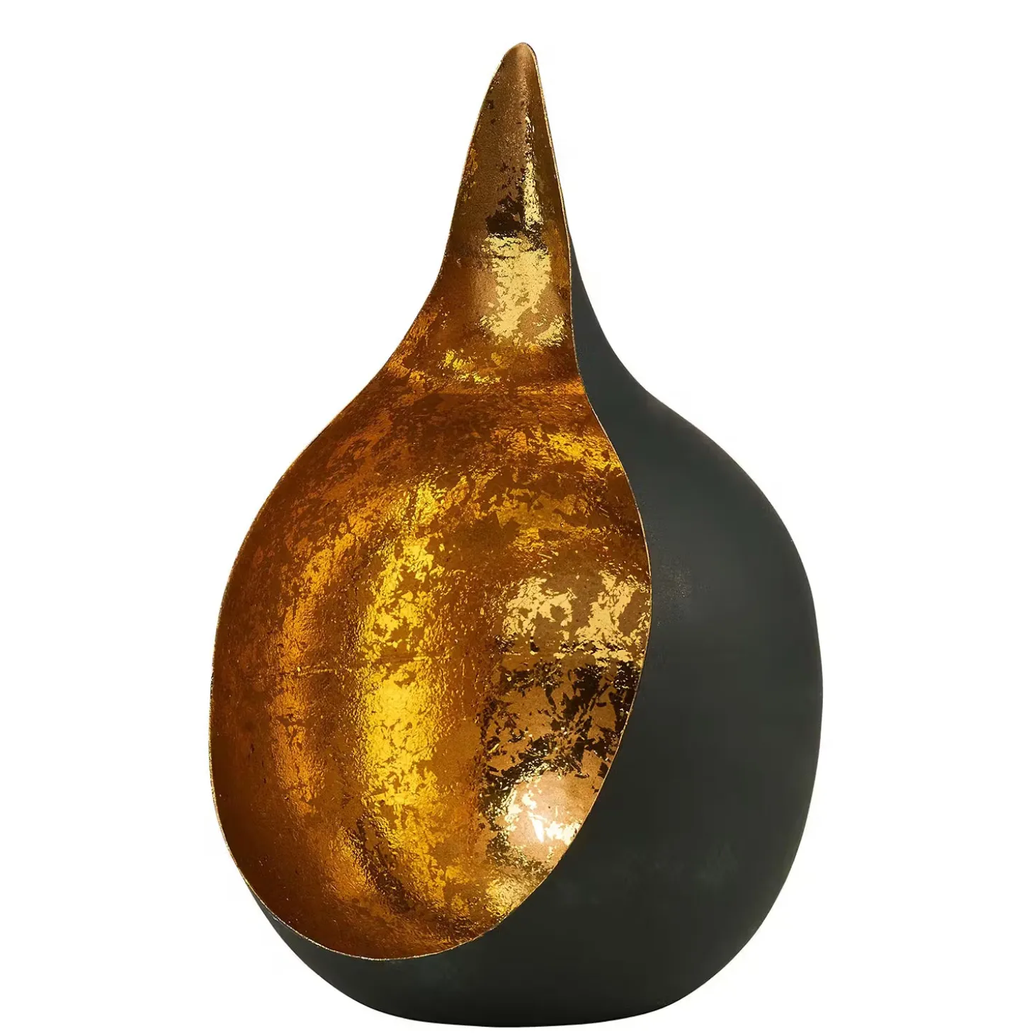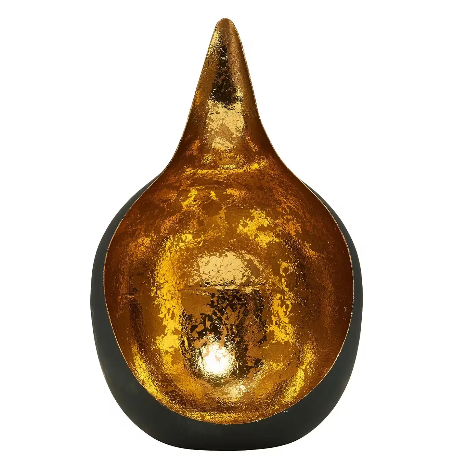 Orient trifft Moderne: Der Delight-Teelichthalter inszeniert alte Formen auf besonders spannende Art ganz neu. Die offene Kugel mit aufragender Spitze ist von außen schlicht und von innen in gebrochenem Metallic mit Antik-Optik gehalten. So entsteht ein faszinierender Gegensatz. In zwei Größen erhältlich.