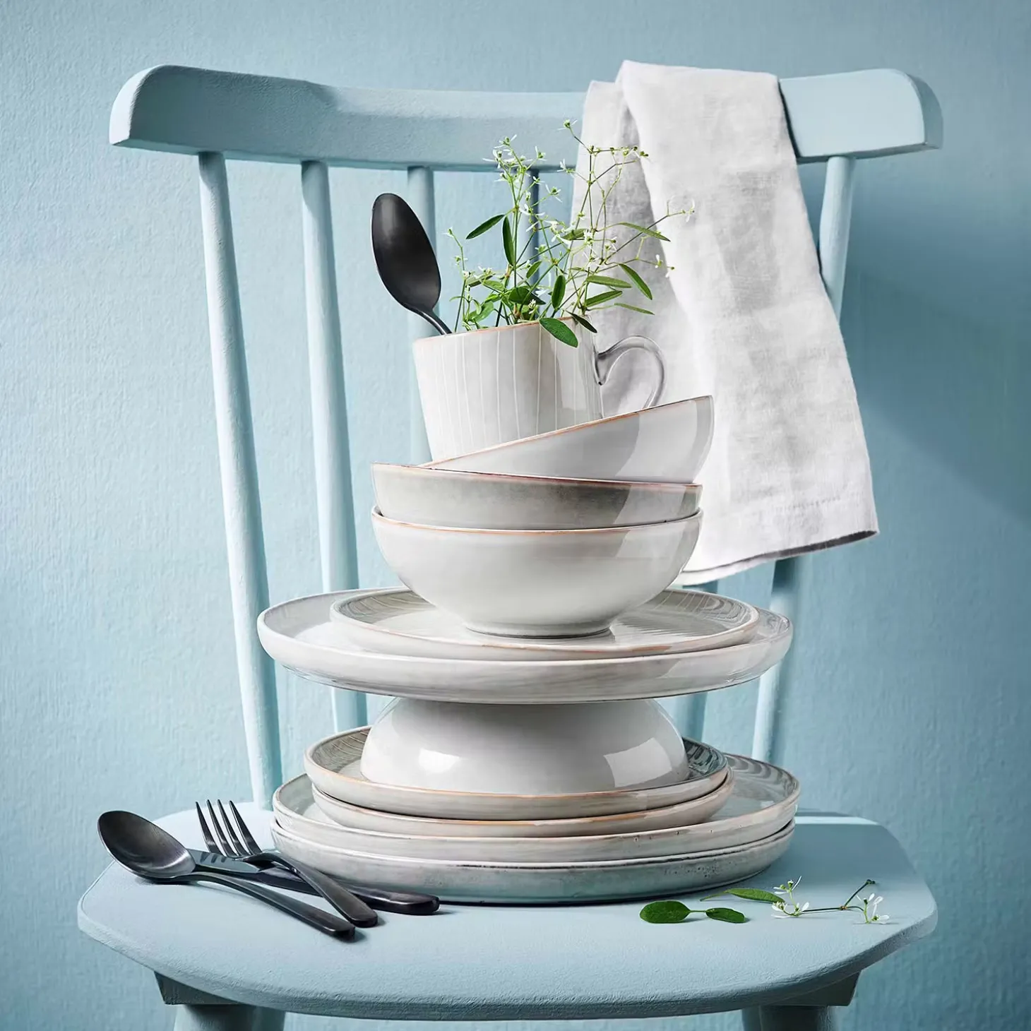- Material: Steinzeug, reaktive Glasur