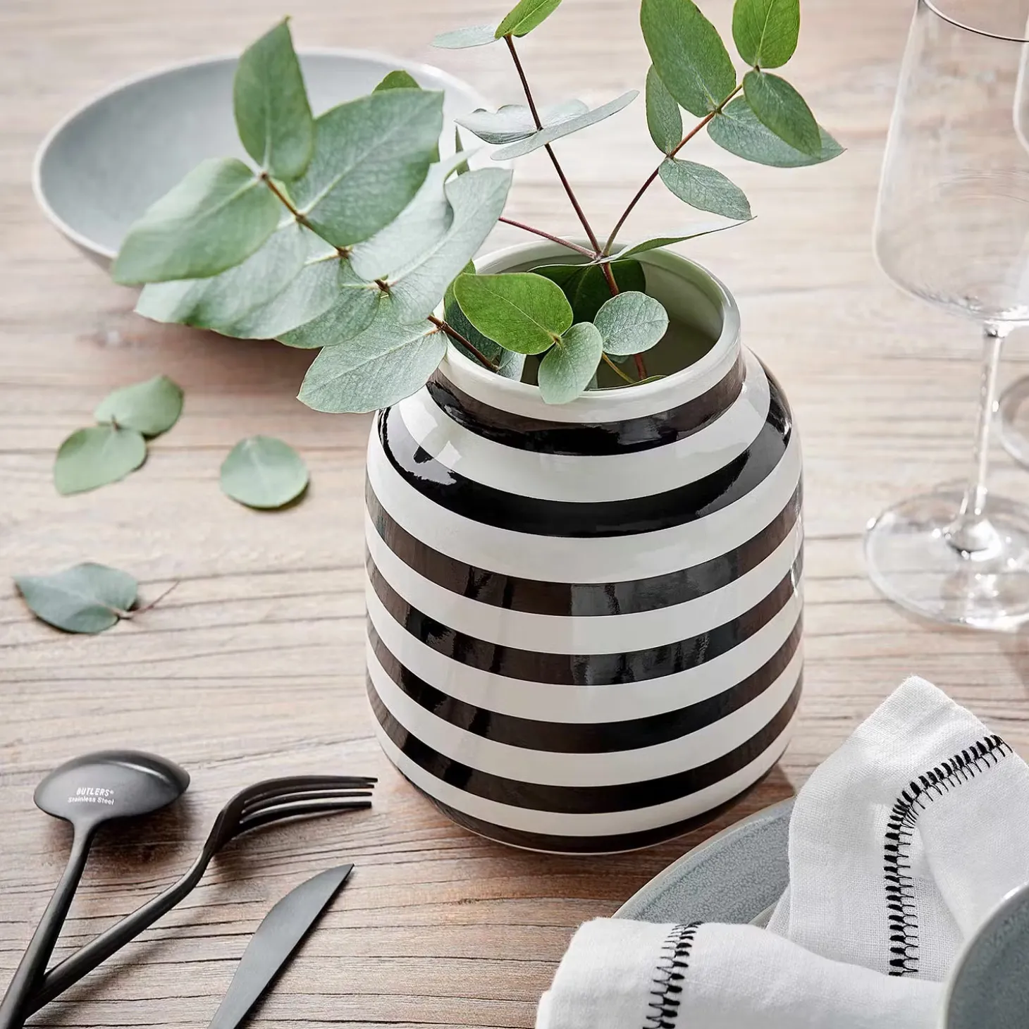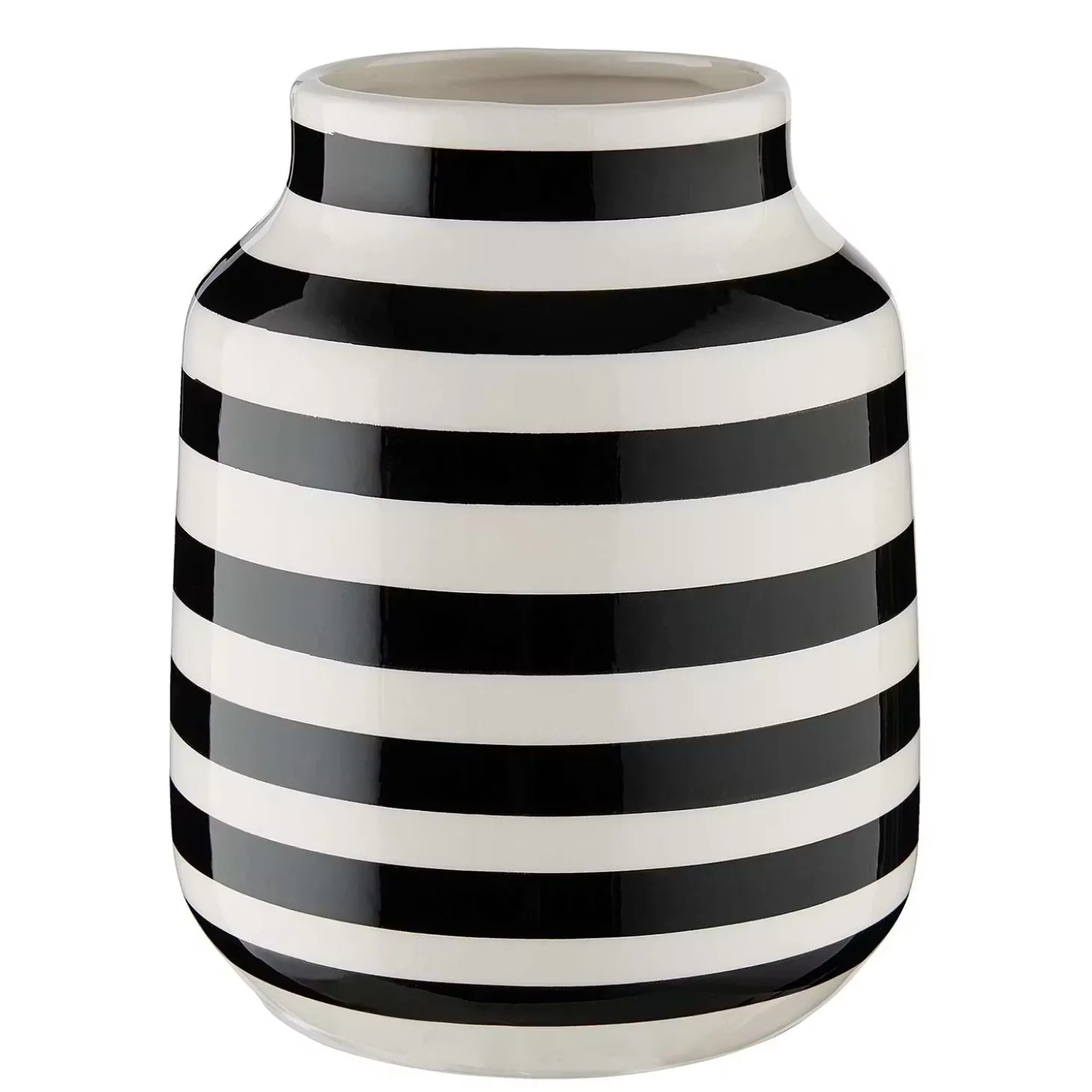 Tapetenwechsel ohne Renovieren: Mit der gestreiften Malika Vase aus Keramik in Schwarz-Weiß für Blumen-Dekos und den gedeckten Tisch bekommt Ihr Zuhause im Handumdrehen einen frischen Look. So setzen Sie z. B. farbige Akzente oder sorgen hier und da für einen schönen Hingucker.