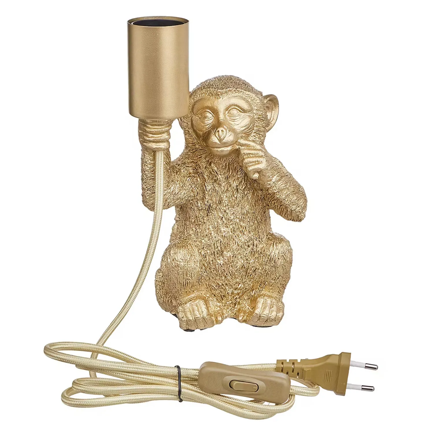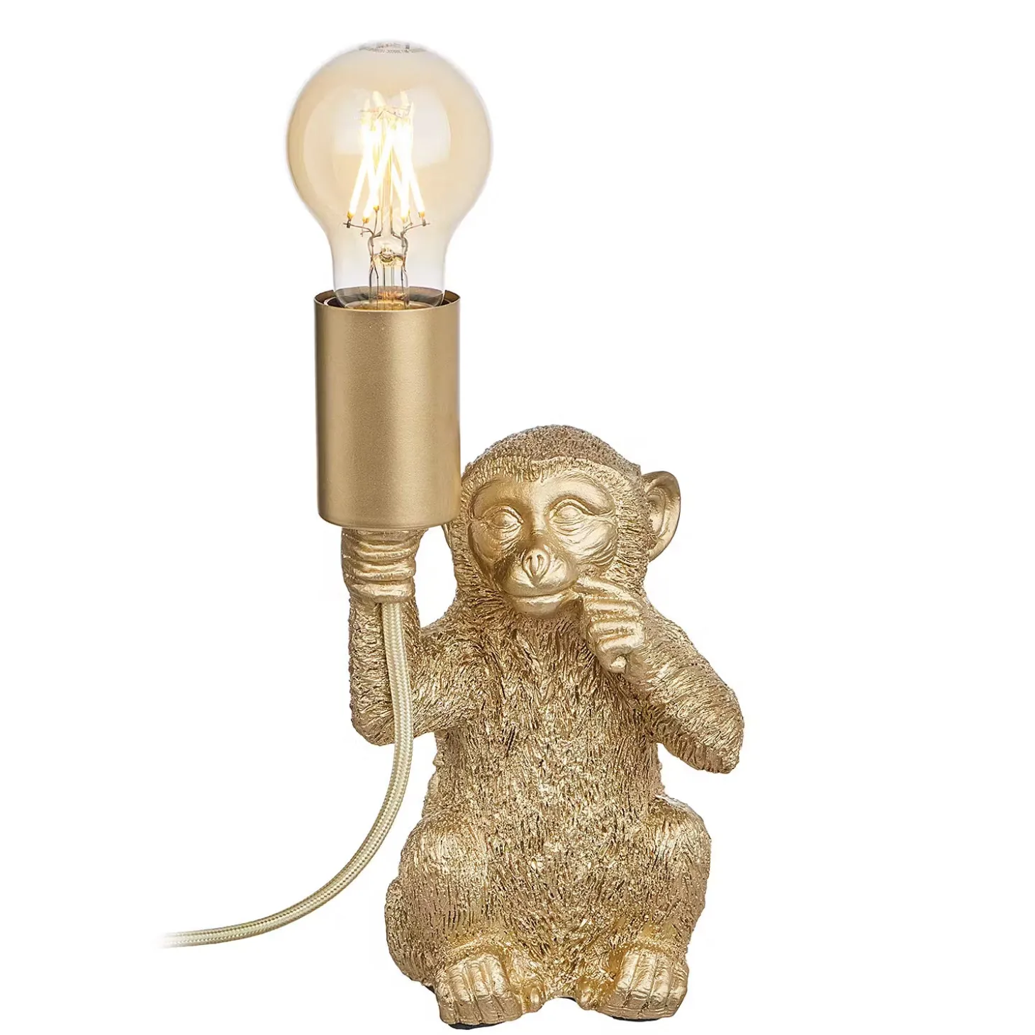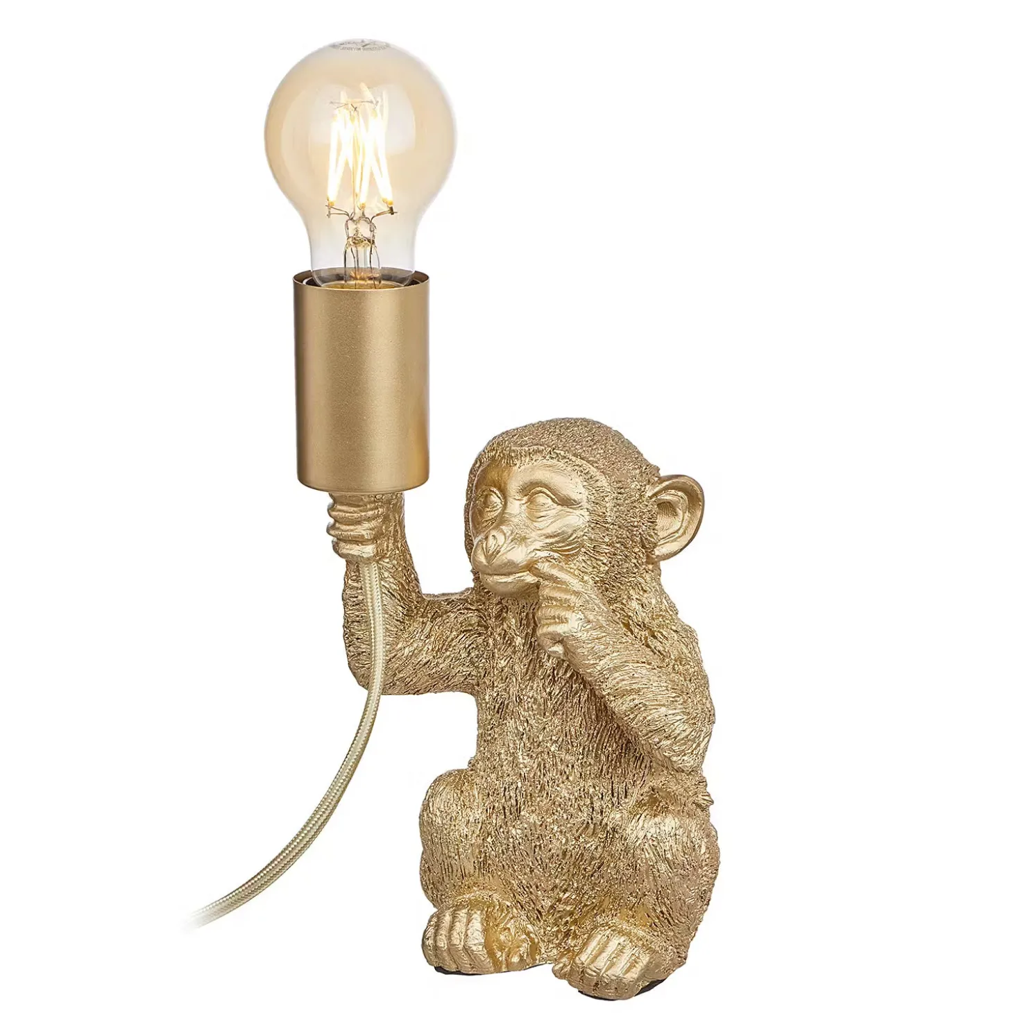 Außergewöhnliche Tierleuchten wie die Monkey Town Tierleuchte Affe sind ein raffiniertes Accessoire, das deinem Zuhause Persönlichkeit verleiht. Mit einem leicht provokanten Augenzwinkern bringt diese Tischlampe in Form eines sitzenden Affen deinen selbstbewussten Stil zum Ausdruck – z.B. als Blickfang im Wohnzimmer. Mit Textilkabel in passender Farbe und Kippschalter. Erhältlich in Gold und in Schwarz.