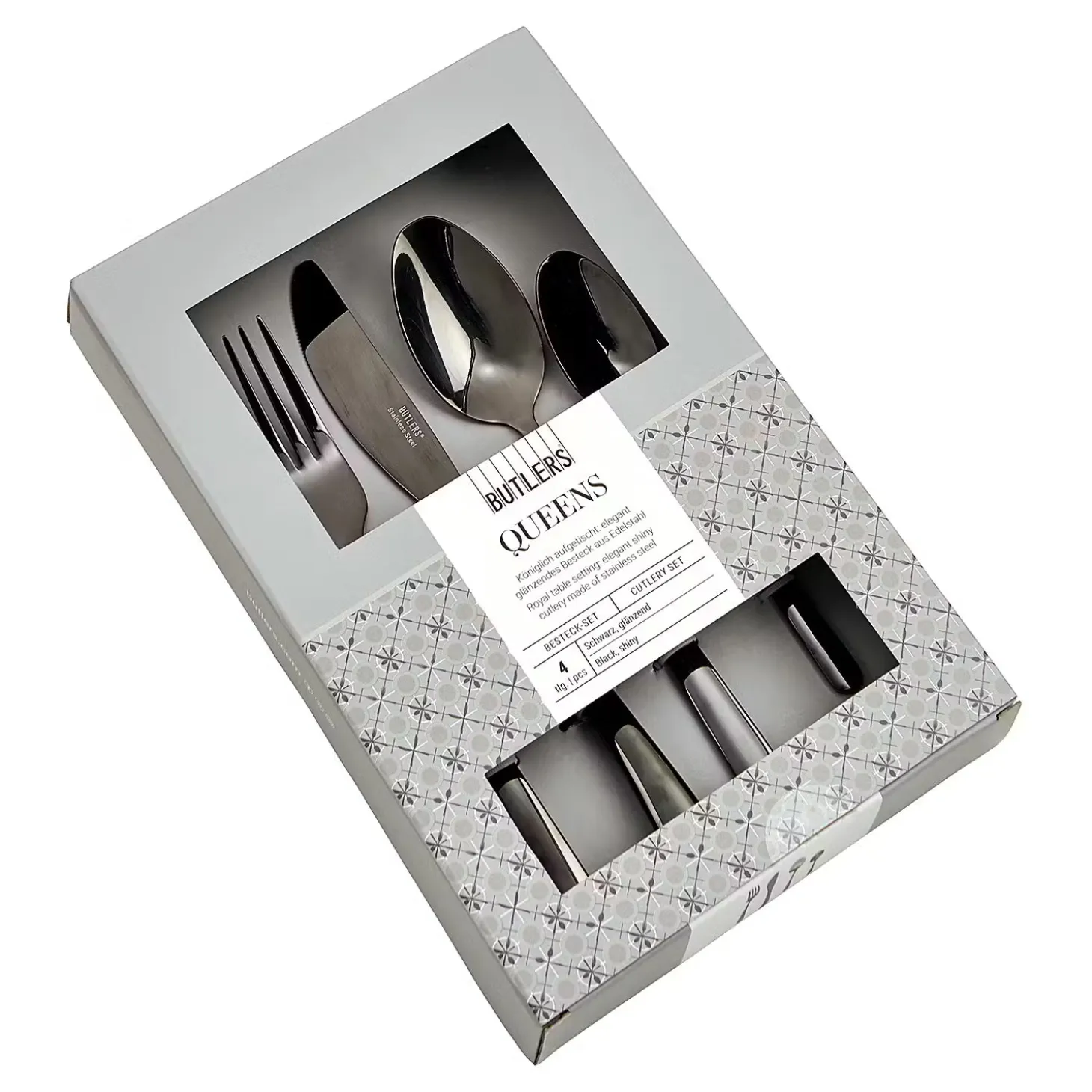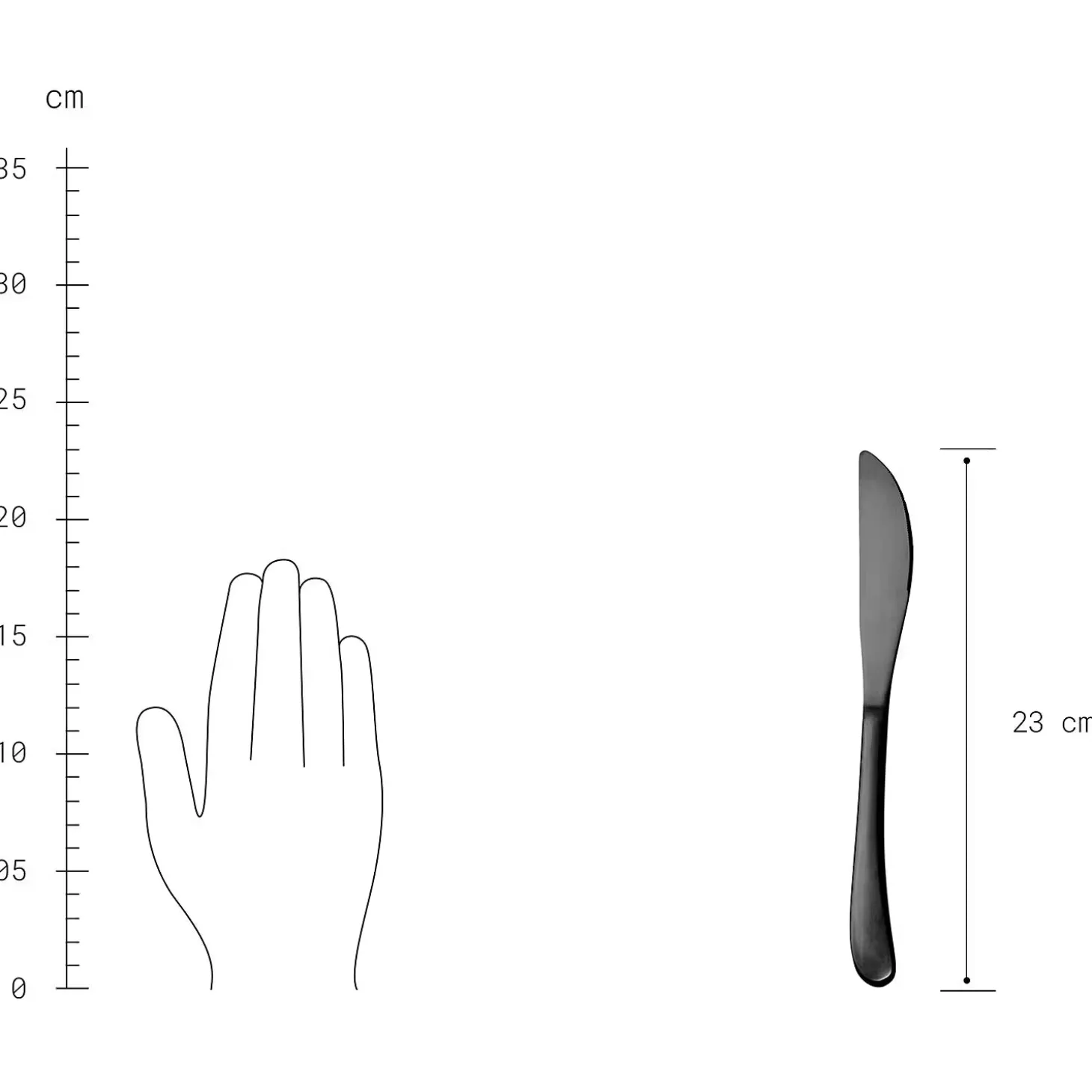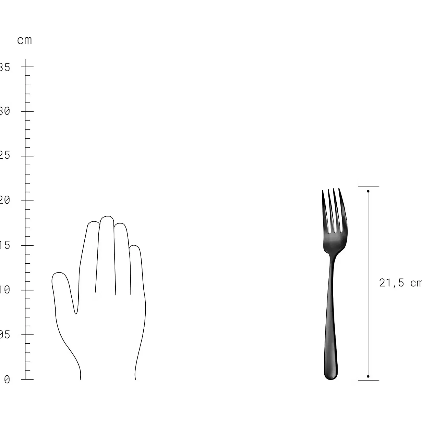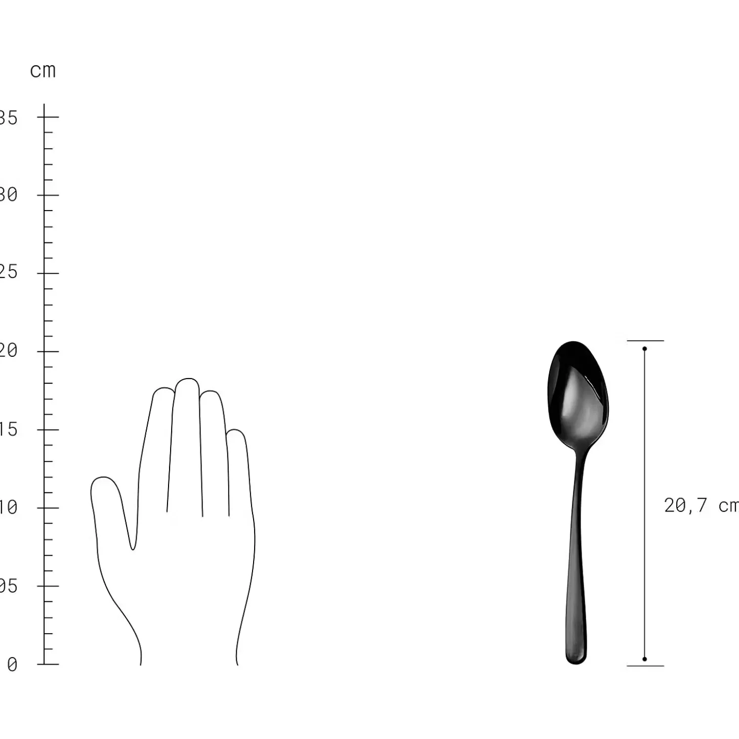 - Weitere Maße: Messer: Länge 23 cm, Gabel: Länge: 21,5 cm, Löffel: Länge 20,7 cm, Teelöffel: Länge 16 cm