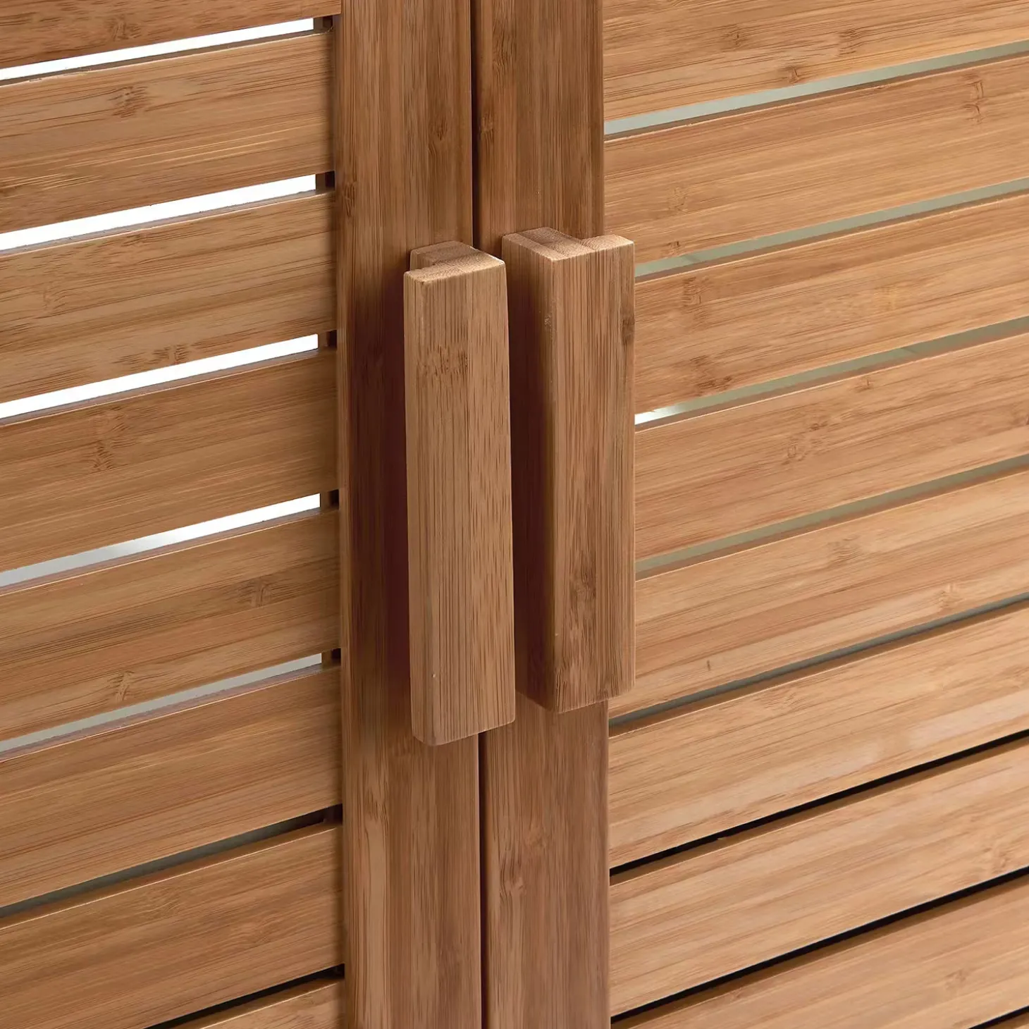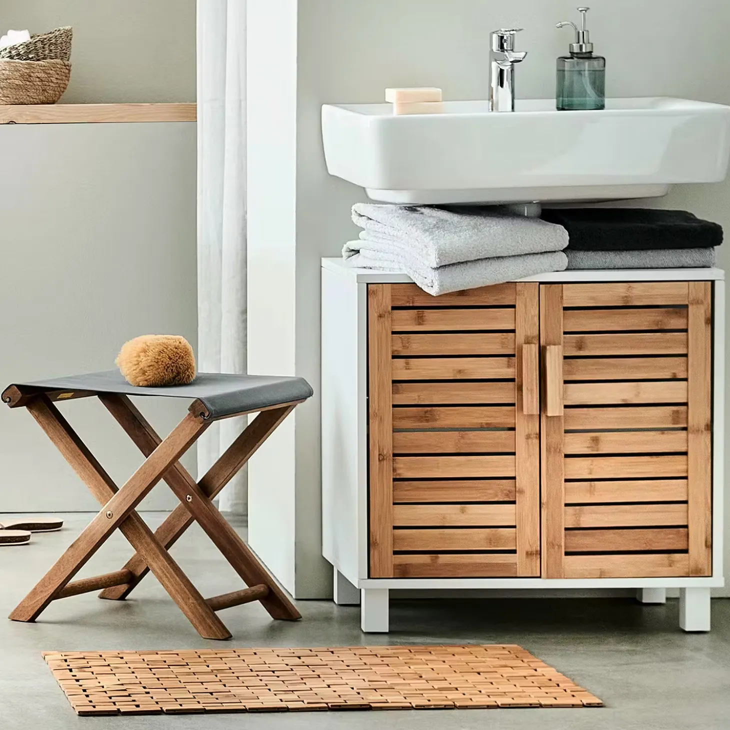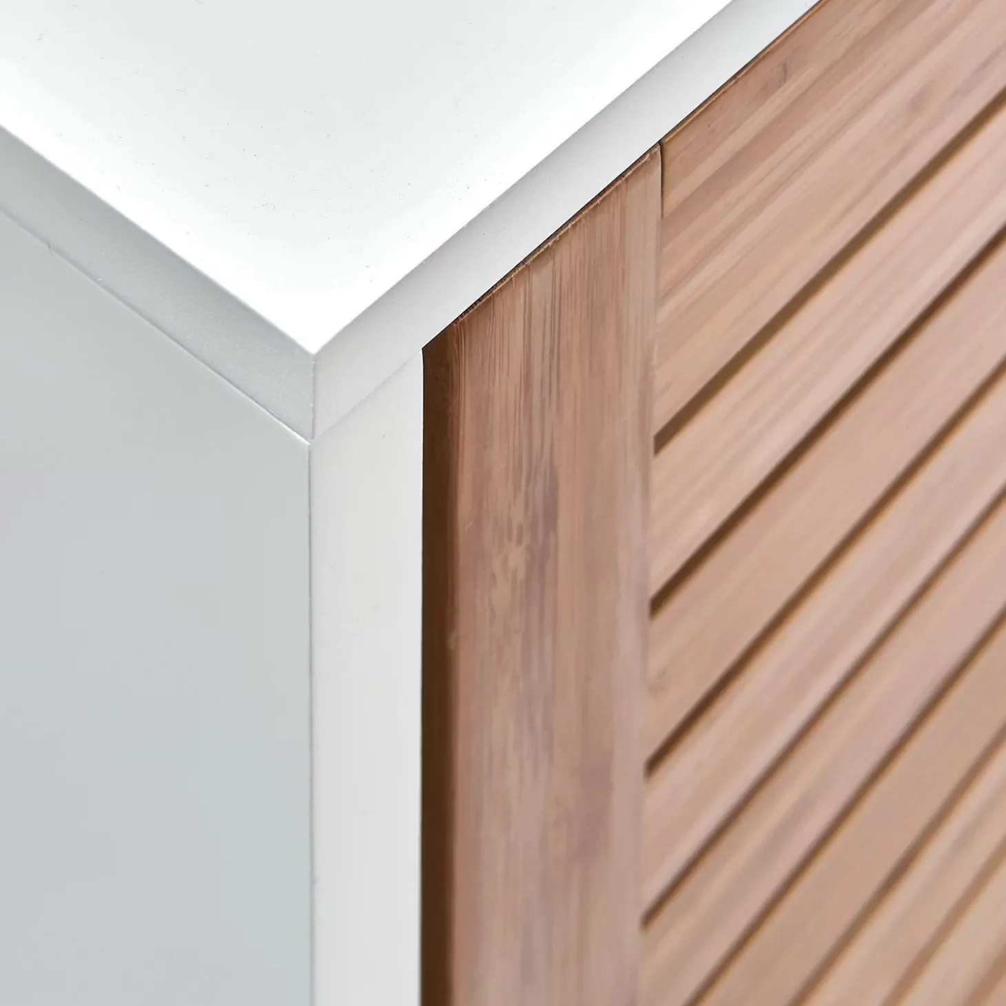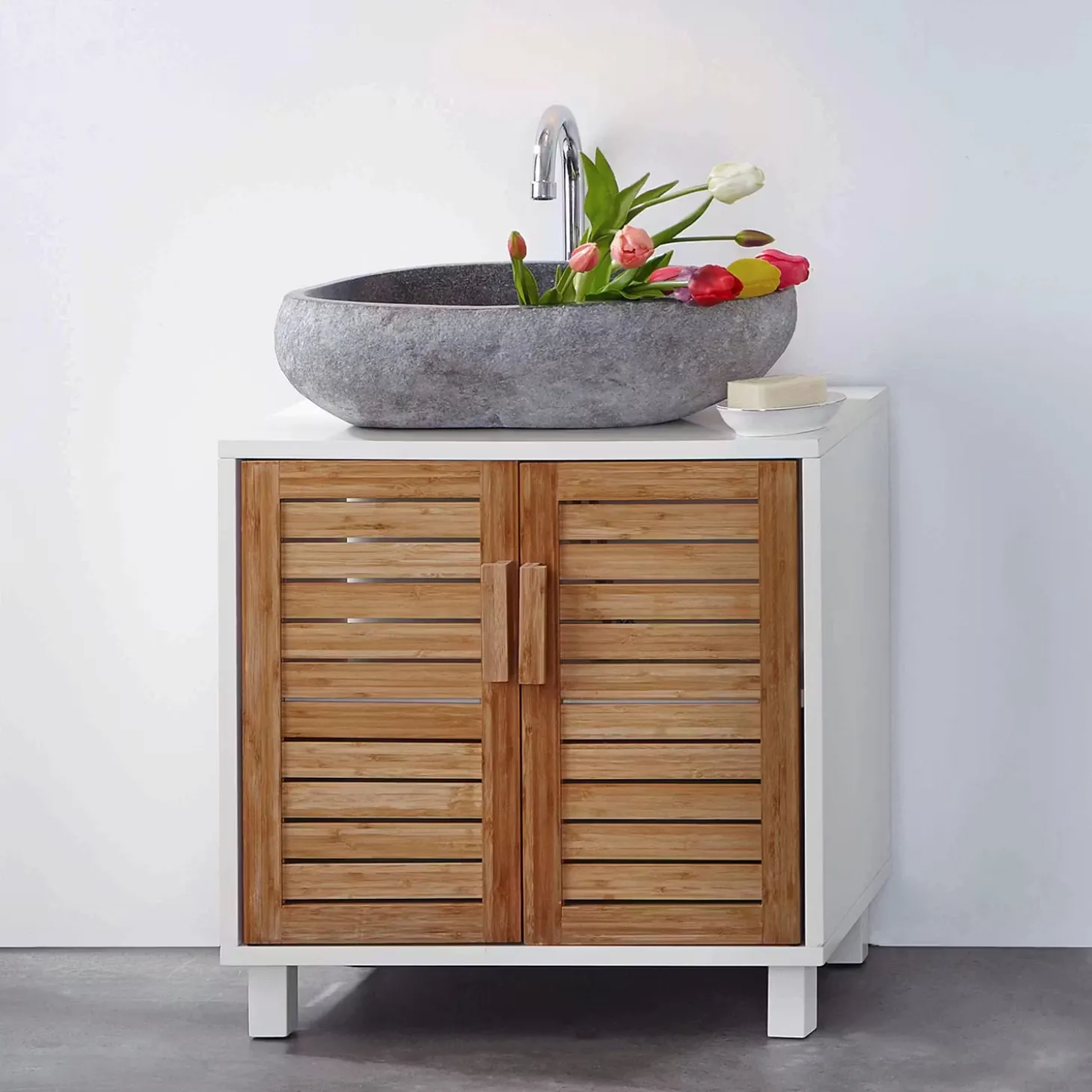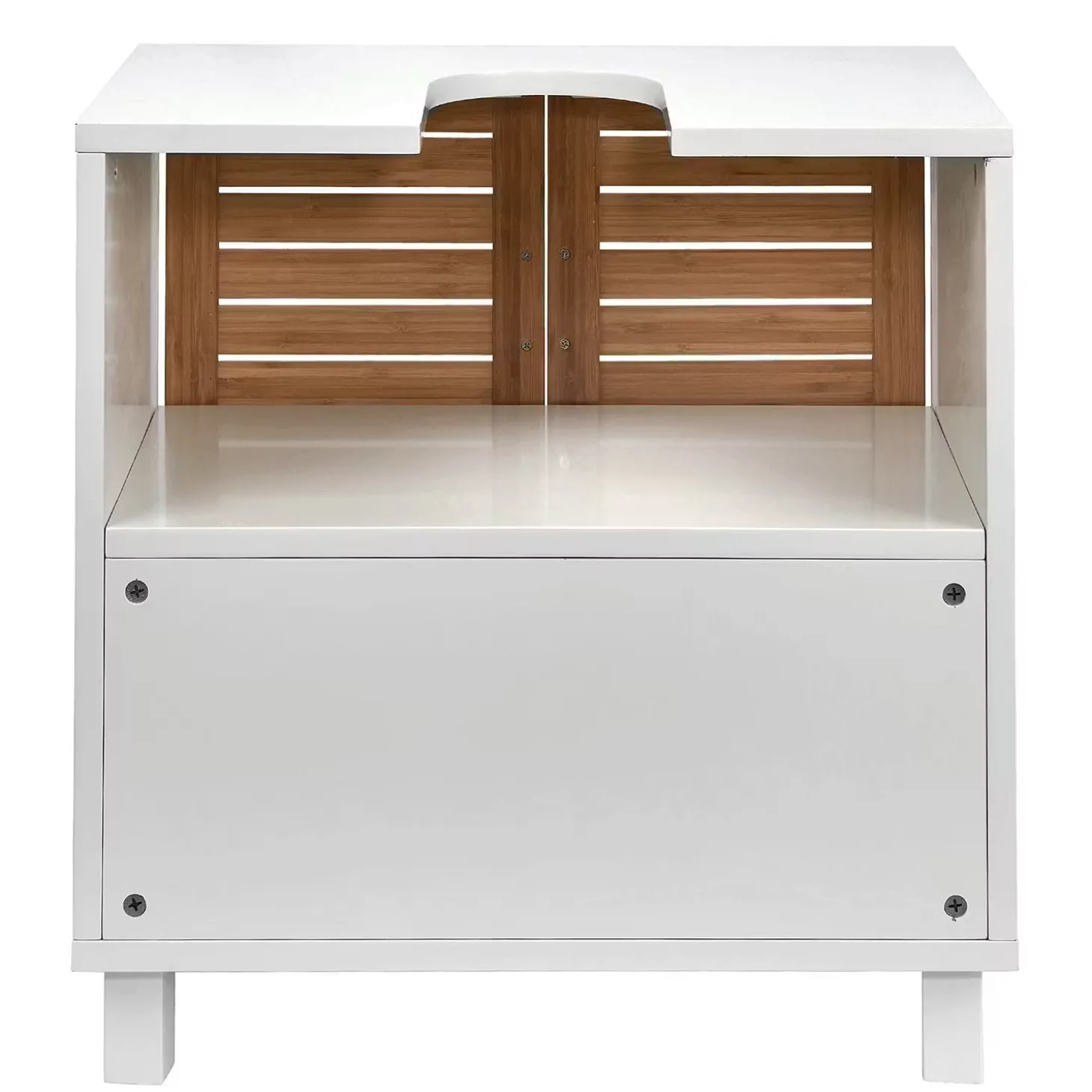 Helle Farben und klare Linien mit praktischer Aufbewahrung in moderner Optik – dieser ordnungsliebende Waschbeckenunterschrank versteht sich direkt mit Ihren Wohnideen und den Anforderungen in Ihrem Badezimmer. Durch die zeitlose Farbkombination aus natur und weiß wirkt er zudem elegant und bietet auf zwei Ebenen optimalen Platz für Ihre Badutensilien. Für ein einfaches Öffnen und Schließen sorgt der Magnetverschluss an den Türen. Durch die Verarbeitung von Bambus, einem schnell nachwachsenden und extrem widerstandsfähigen Rohstoff, punkten Sie zudem in Sachen Nachhaltigkeit. Dies kommt nicht nur der Umwelt zugute, sondern zeigt sich auch in der Langlebigkeit unserer Möbel. Weitere Produkte der Serie erhältlich.Bambus Waschbeckenunterschrank in hellem WeißKlassisches Design und unkomplizierter GebrauchLänge 60 x Breite 38 x Höhe 61 5cm Unterstau 8cmRegalbodenabstand 23 5 cm Ausschnitt 16 x 25 cmAus Bambus MDF