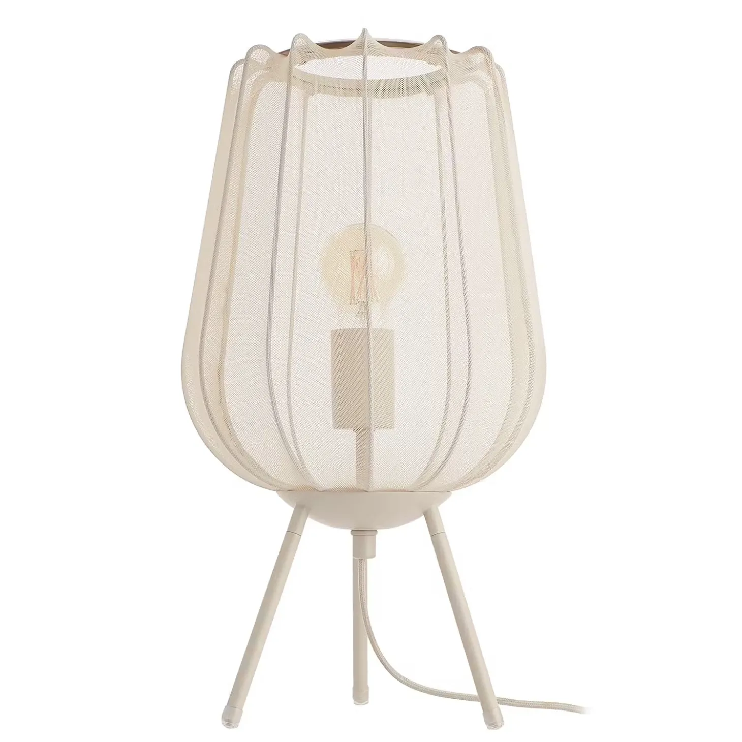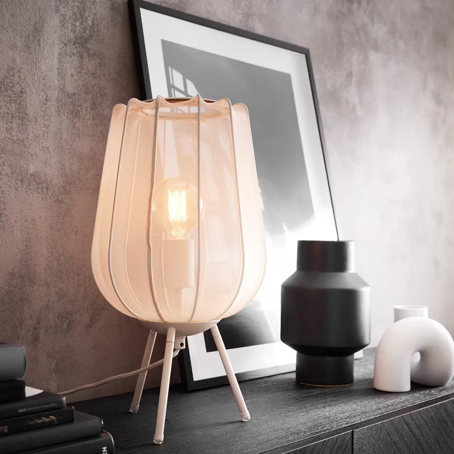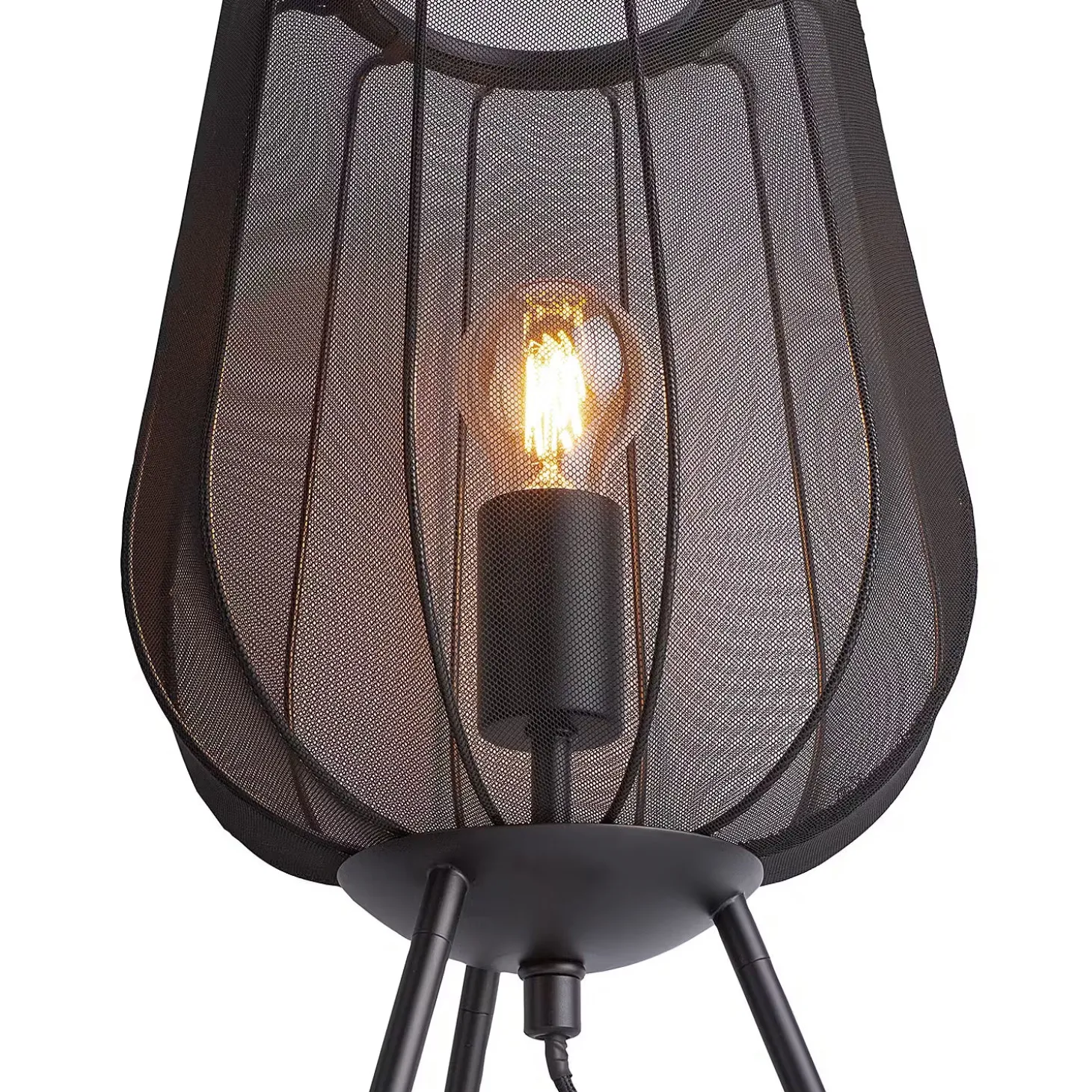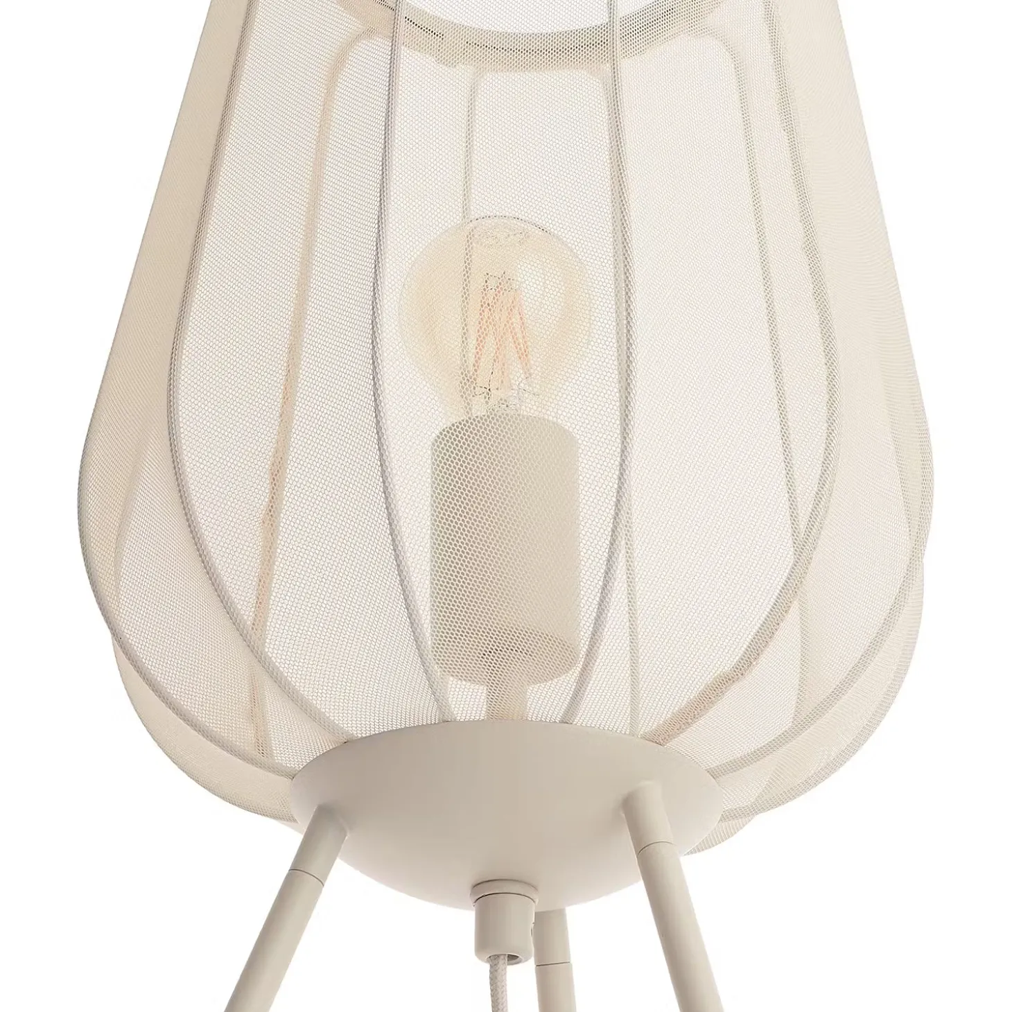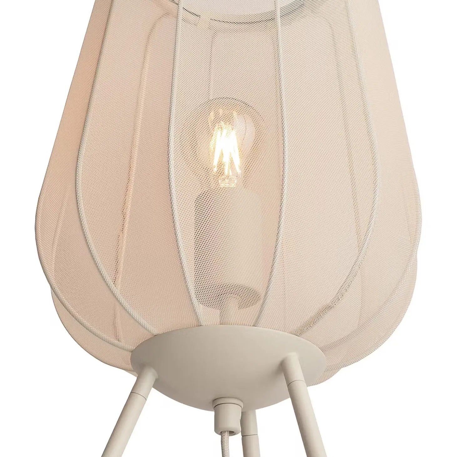 Ein Hauch von Extravaganz umgibt die moderne Amal Tischleuchte. Ihr hoher, geschwungener Schirm ist mit einem transparentem Netzgewebe überzogen und thront auf drei Beinen aus Eisen. Gerade diese Verbindung von exklusivem Design und hochwertiger Materialauswahl verleiht der Tischleuchte eine fast geheimnisvolle Ausstrahlung. In Creme und Schwarz erhältlich, auch als passende Stehleuchte und Hängeleuchte.
