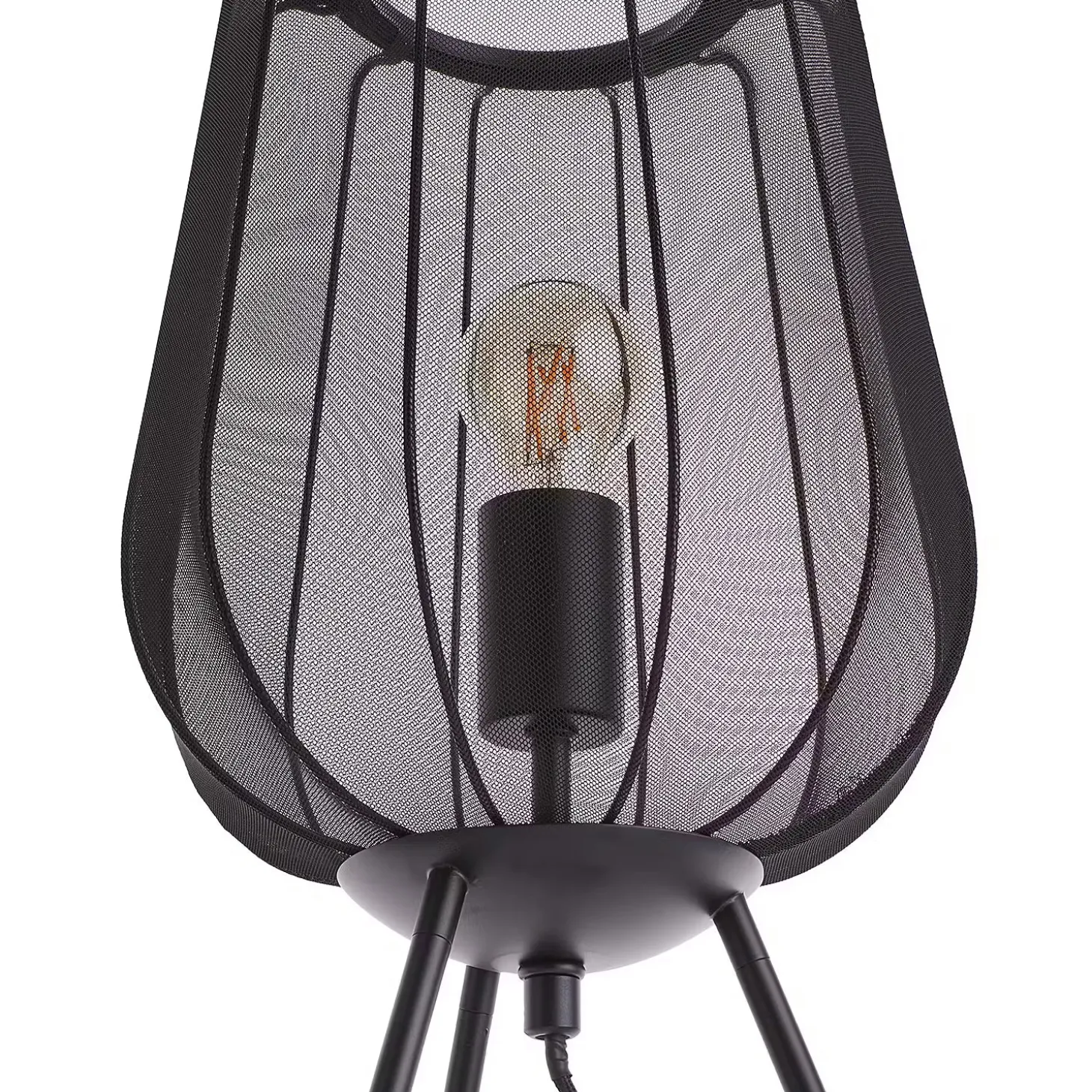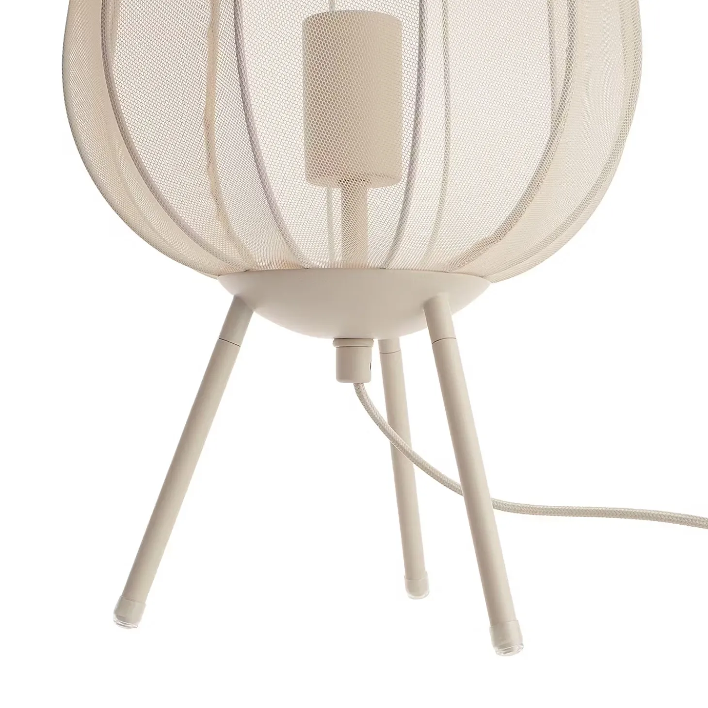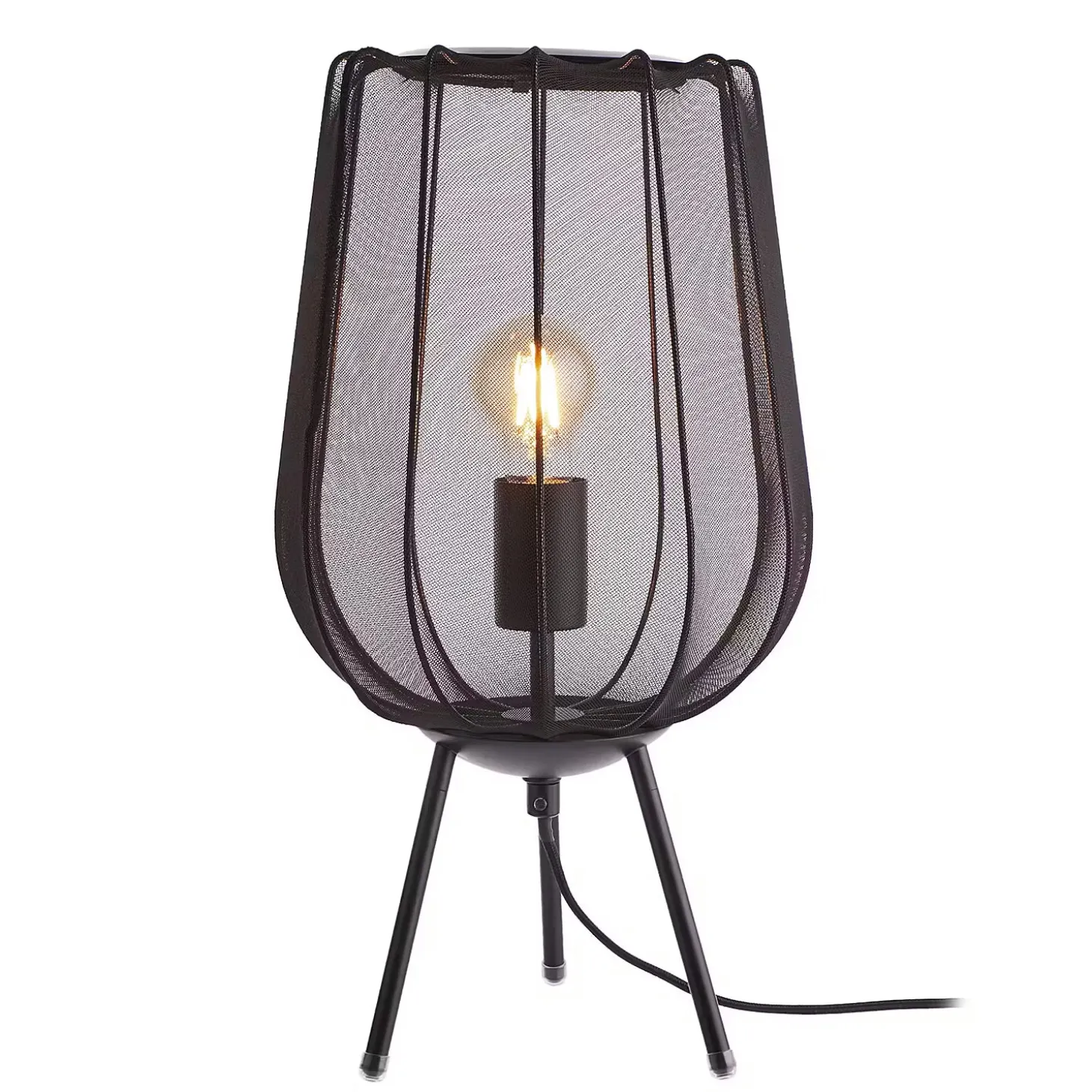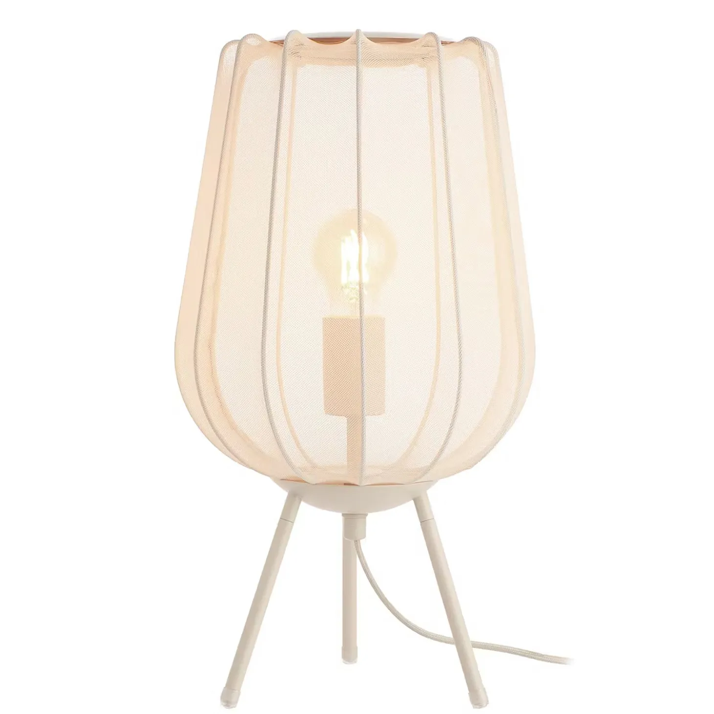 Ein Hauch von Extravaganz umgibt die moderne Amal Tischleuchte. Ihr hoher, geschwungener Schirm ist mit einem transparentem Netzgewebe überzogen und thront auf drei Beinen aus Eisen. Gerade diese Verbindung von exklusivem Design und hochwertiger Materialauswahl verleiht der Tischleuchte eine fast geheimnisvolle Ausstrahlung. In Creme und Schwarz erhältlich, auch als passende Stehleuchte und Hängeleuchte.