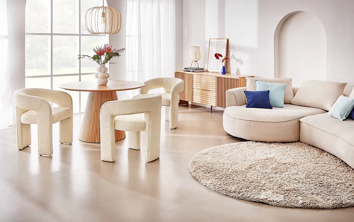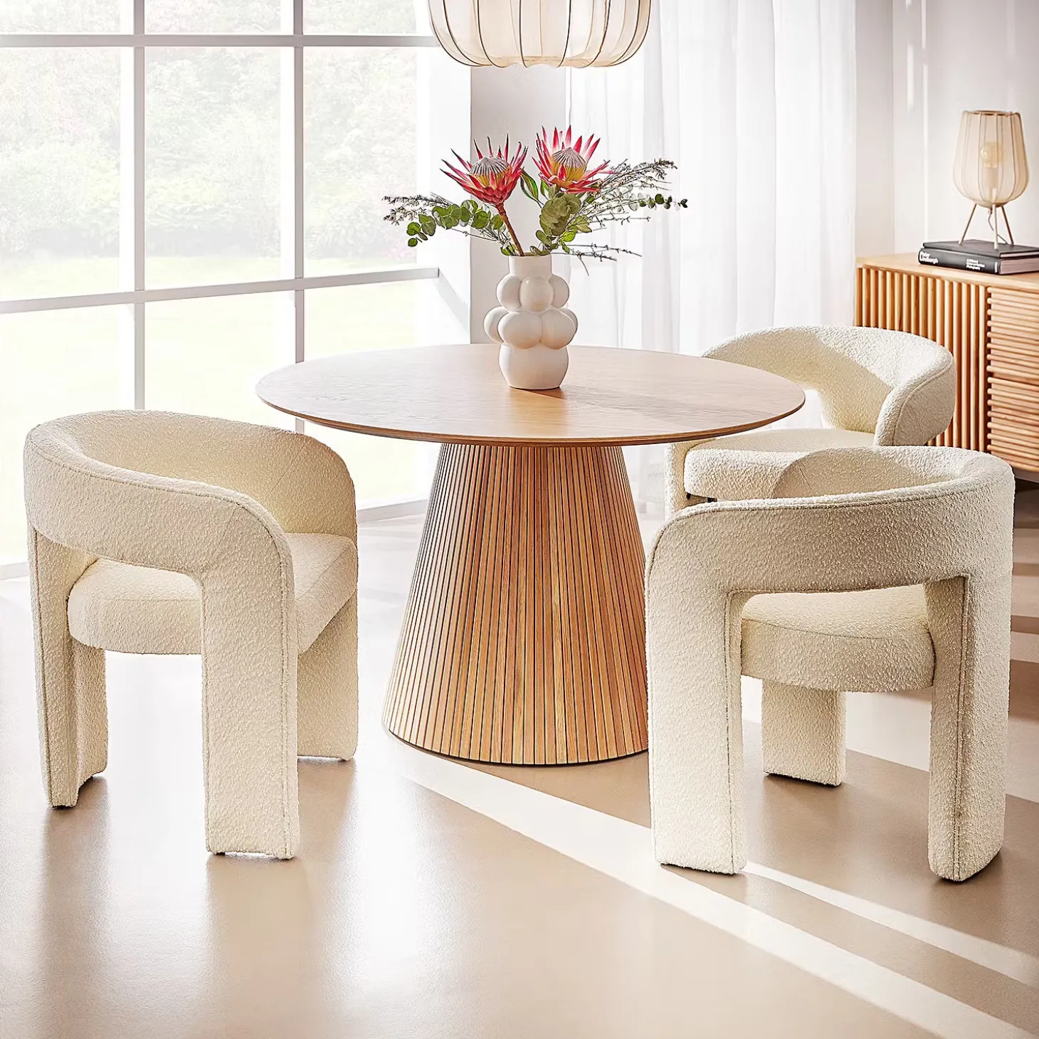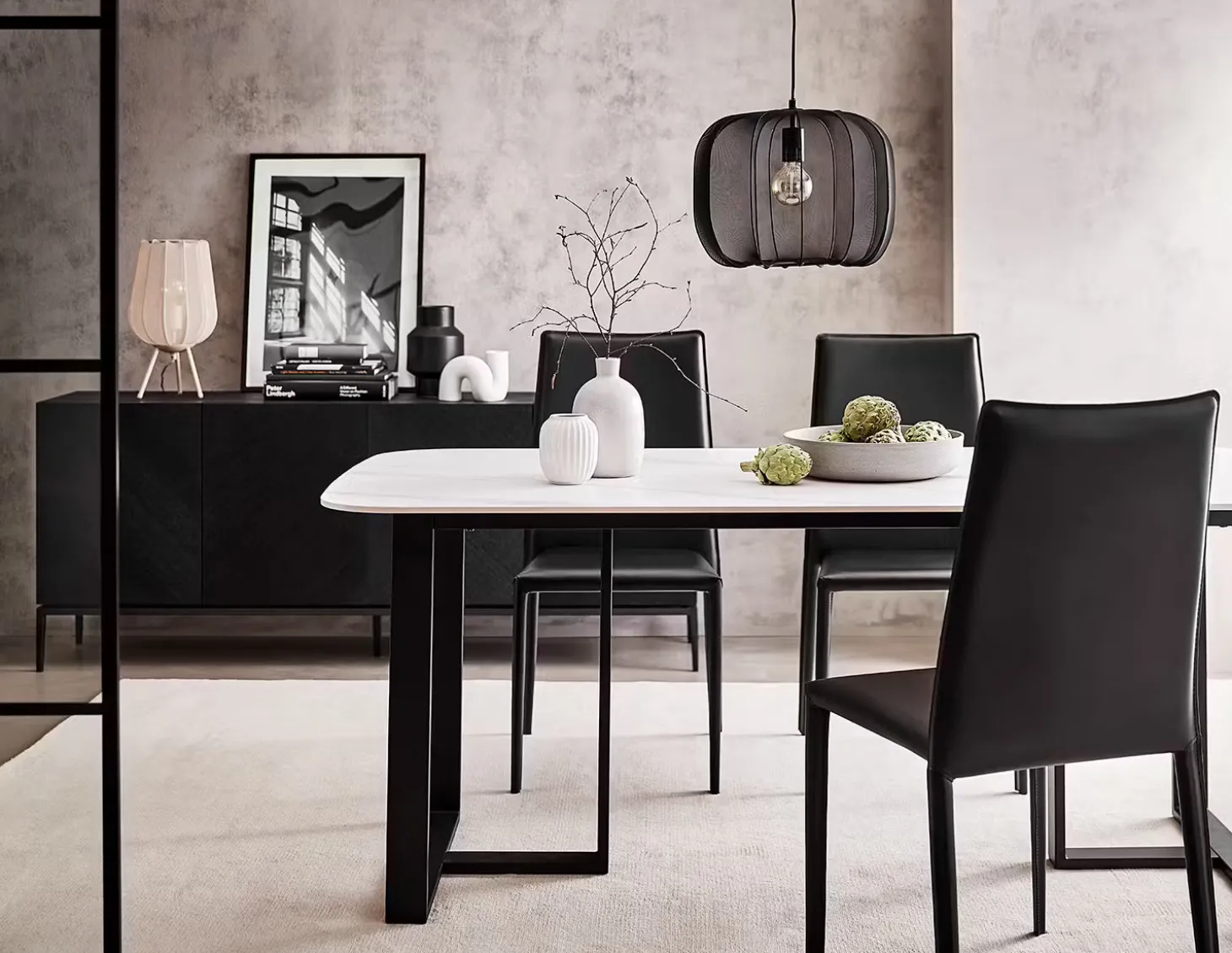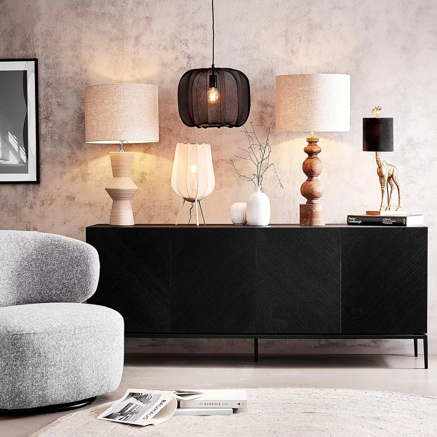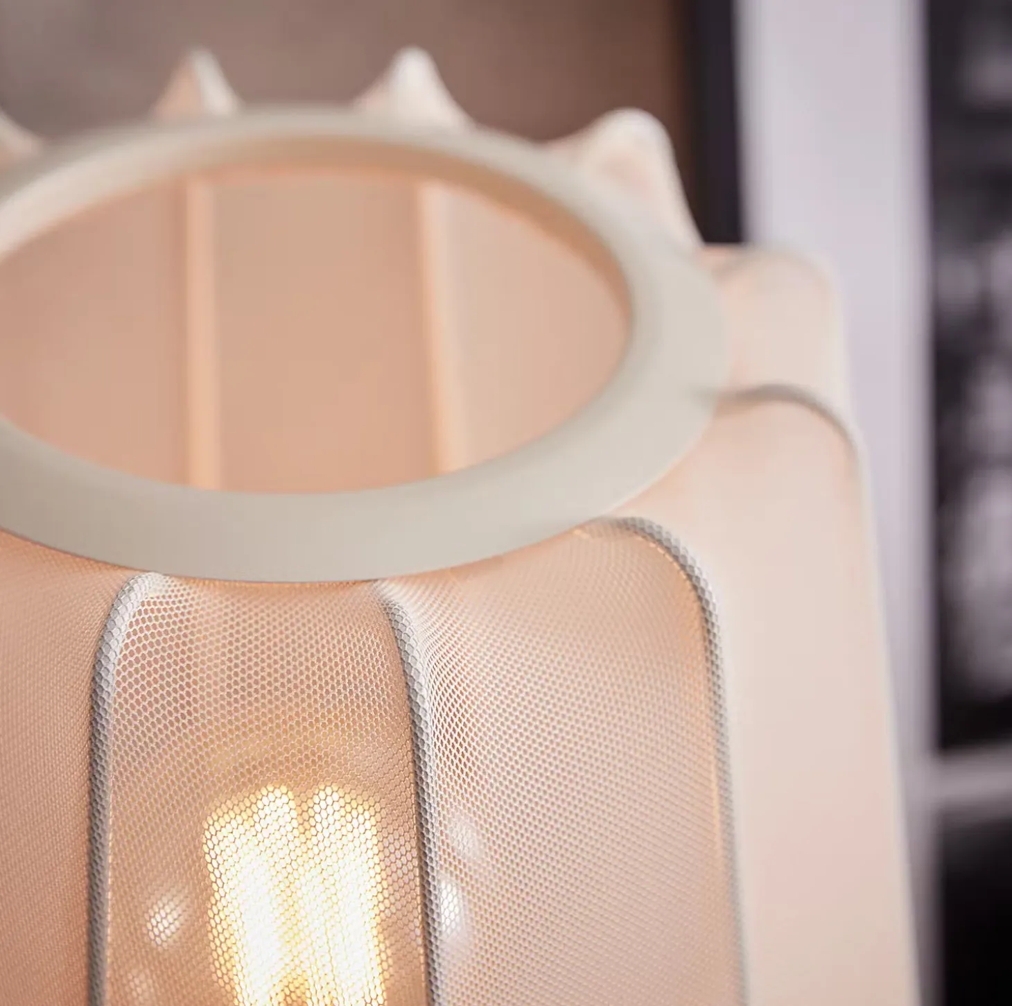 Ein Hauch von Extravaganz umgibt die moderne Amal Tischleuchte. Ihr hoher, geschwungener Schirm ist mit einem transparentem Netzgewebe überzogen und thront auf drei Beinen aus Eisen. Gerade diese Verbindung von exklusivem Design und hochwertiger Materialauswahl verleiht der Tischleuchte eine fast geheimnisvolle Ausstrahlung. In Creme und Schwarz erhältlich, auch als passende Stehleuchte und Hängeleuchte.