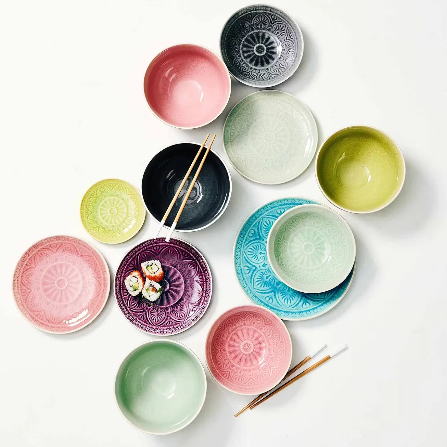 - Weitere Qualitätsmerkmale: Handbemalte und robuste Keramik in zarter Optik Kontrast: Glänzende Innenglasur und matte Außenglasur. Fühlbare Reliefstruktur in leuchtenden, harmonischen Farben. Krakelee-Effekt: gesprungene Glasur nach asiatischem Vorbild. Hervorragend kombinierbar für Hochzeit, Festessen, Sommerparty.